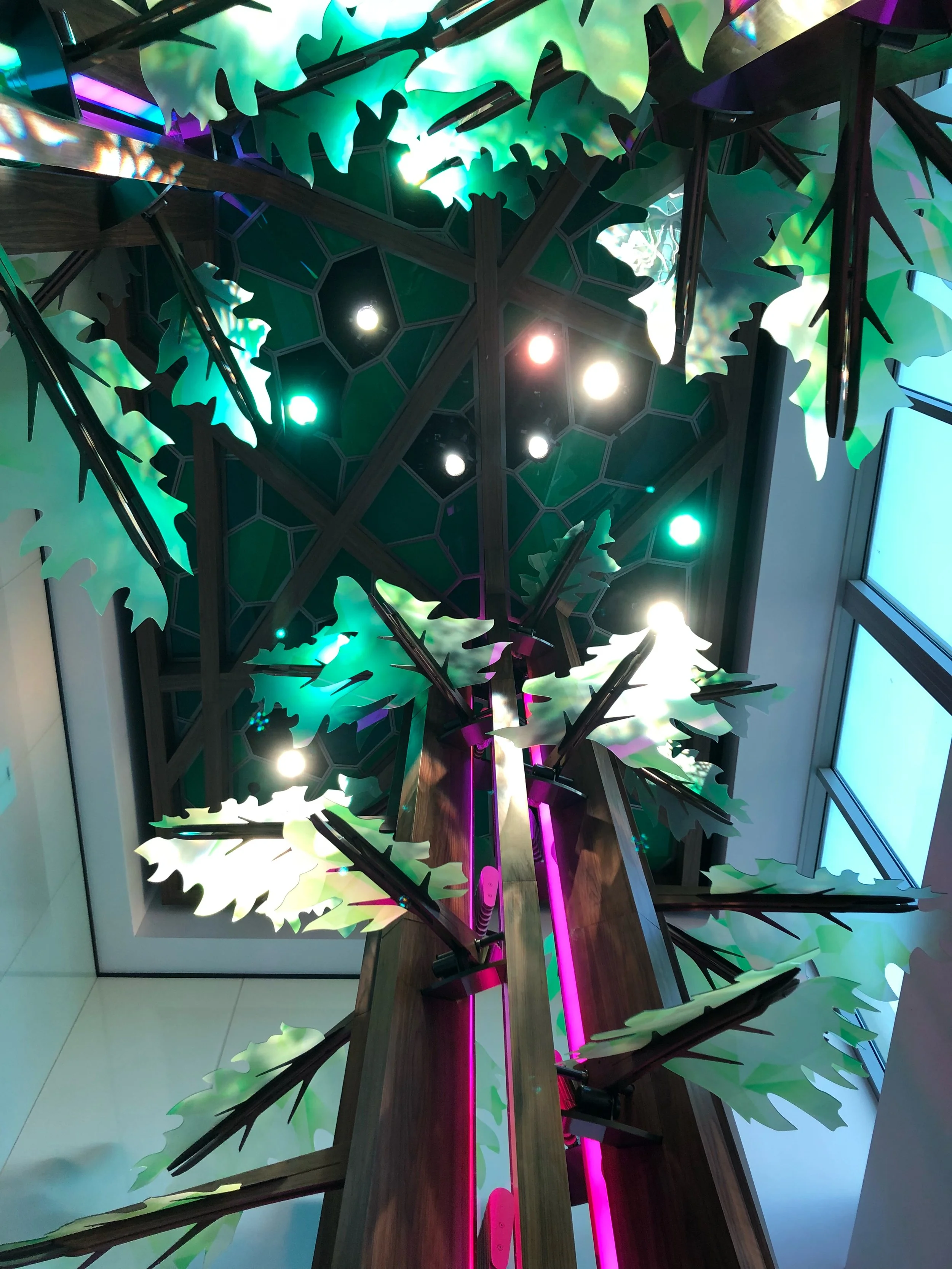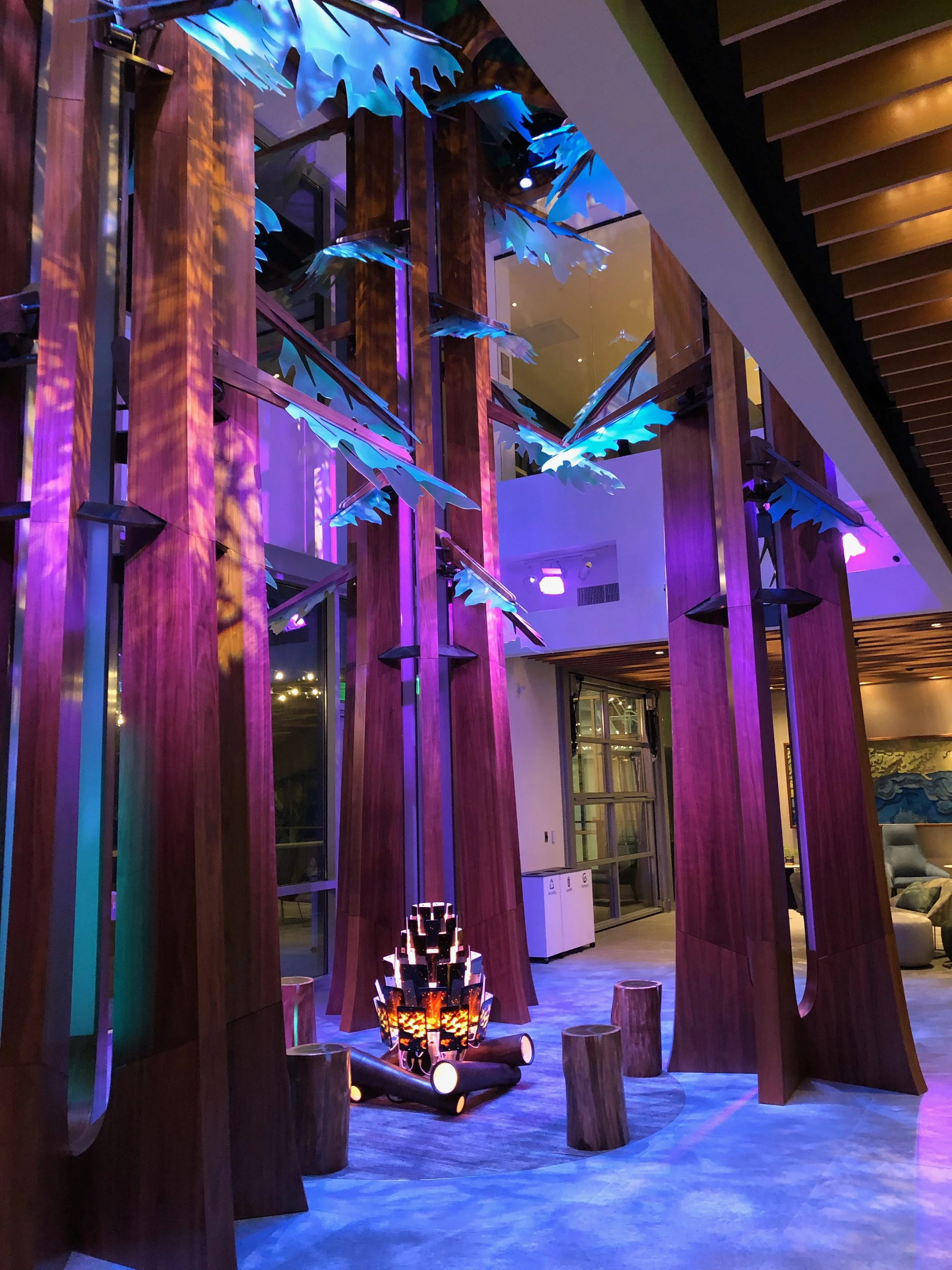 The Grove Installation consists of three trees that span floor to ceiling across two stories, as well as a digital campfire in the center that is controlled by a google assistant.
