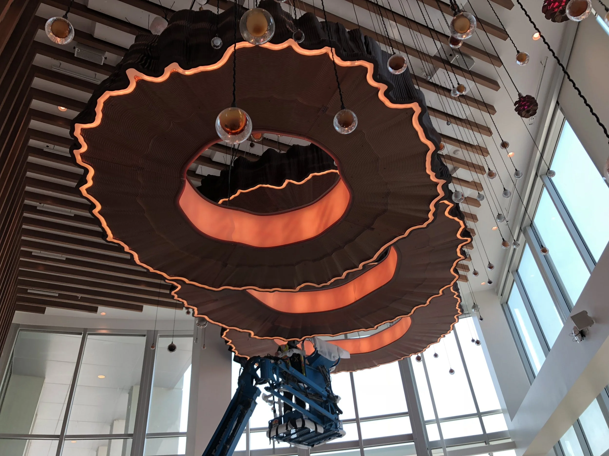 There are nearly 500 hand-blown glass pendants in the space that vary from 1 to 6 inches in diameter. Each pendant has a small warm LED light resting on top, which is being driven by a an electrical system within the panels they hang from.
