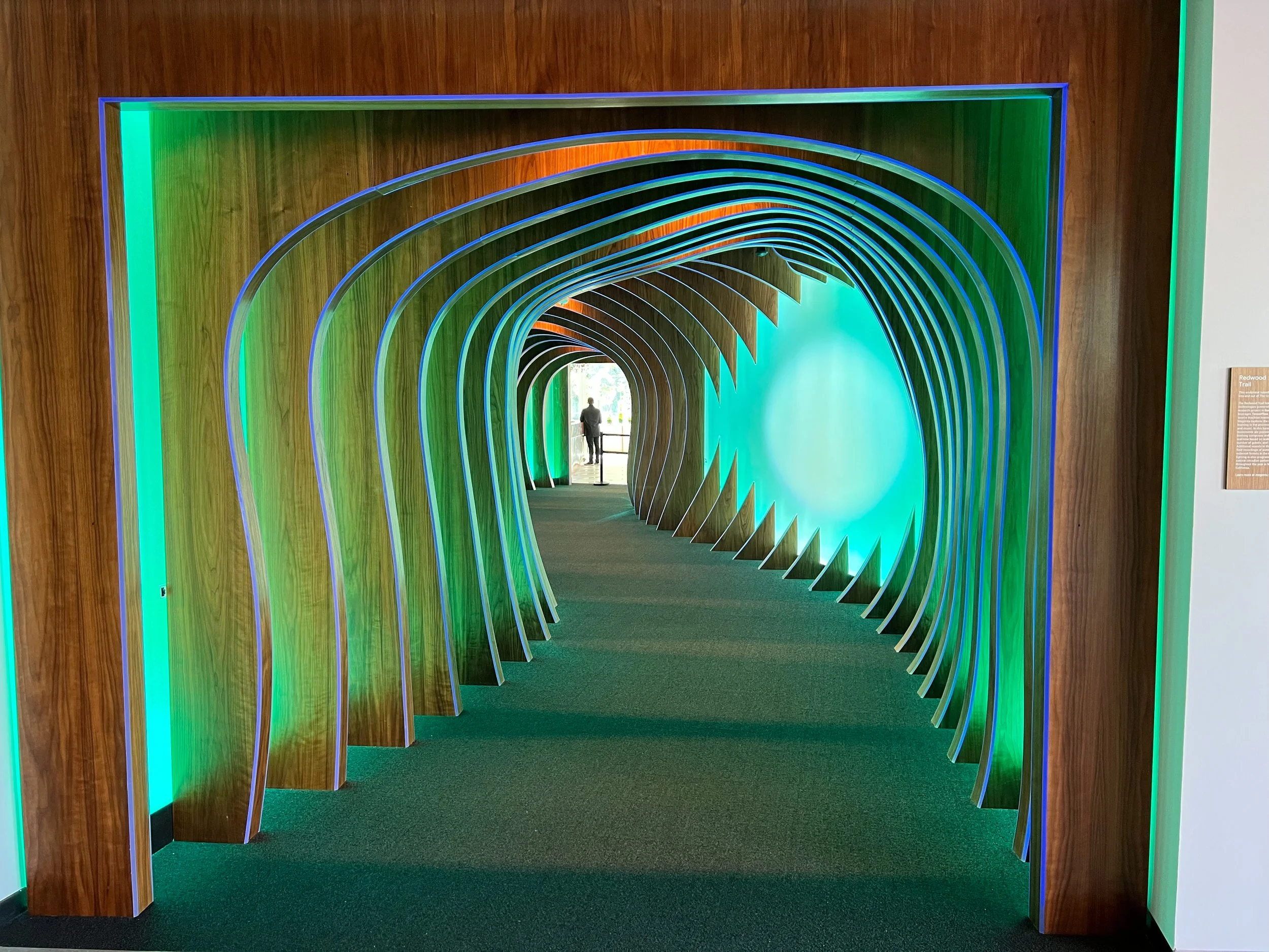 The Redwood Trail is a compression space composed of 30 ribs, each of which is veneered in a dark walnut and is edge lit to outline the shape of the of the tunnel.